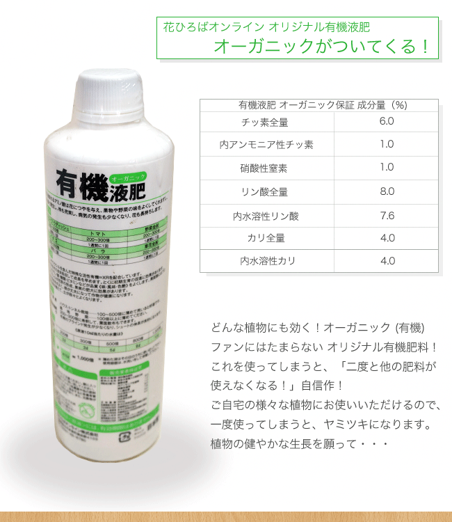 有機液肥オーガニックは葉面吸収できるタイプで希釈して使用する液体肥料です。