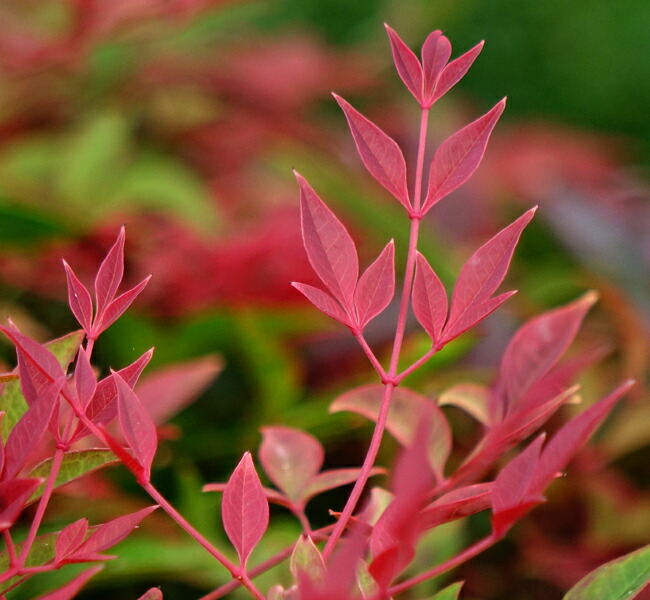 春だけでなく、夏の間に伸び出す新葉も赤く染まり美しい品種です。11月から4月まで、真っ赤に紅葉しきれいです。葉がたくさんつくので、お料理の飾りに使うのにもぴったりの品種です。花や実はつきませんが、ナンテンは、「難を転ずる」厄除けの木として、昔から多くの家の庭に植えられてきました。