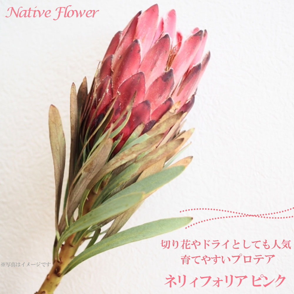 「ネリイフォリア」は、キョウチクトウに似た葉を持つことから学名が付けられた系統です。苞葉の縁が黒っぽく縁取られているのが特徴。ミンクのような柔らかい質感が魅力です。花の形はキングプロテア等の様に大きく開くことは無く、開花がすすんでもカップ状で切り花としても人気です。プロテアの中では育てやすく、クリーム色のクリームミンクとピンク色のピンクミンクの2品種が代表的です。