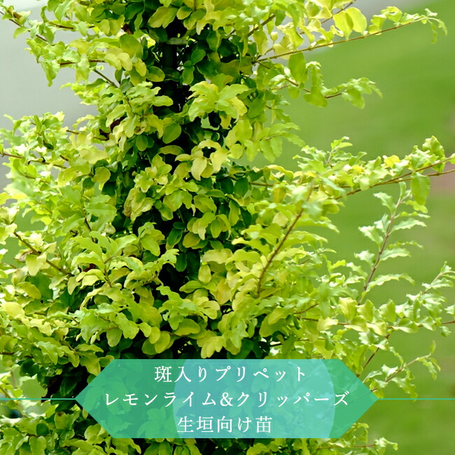 レモンライム&クリッパーズは、プリペットの斑入り葉品種で緑字に黄色の外斑が入るカラーリーフです。鮮やかな葉色が特徴的です。斑は新芽のころによく出るので、刈り込んでいただくと、よりたくさんの斑入り葉が楽しめます。黄色い斑は徐々にライムグリーンに色を変えていずれ緑葉になります。