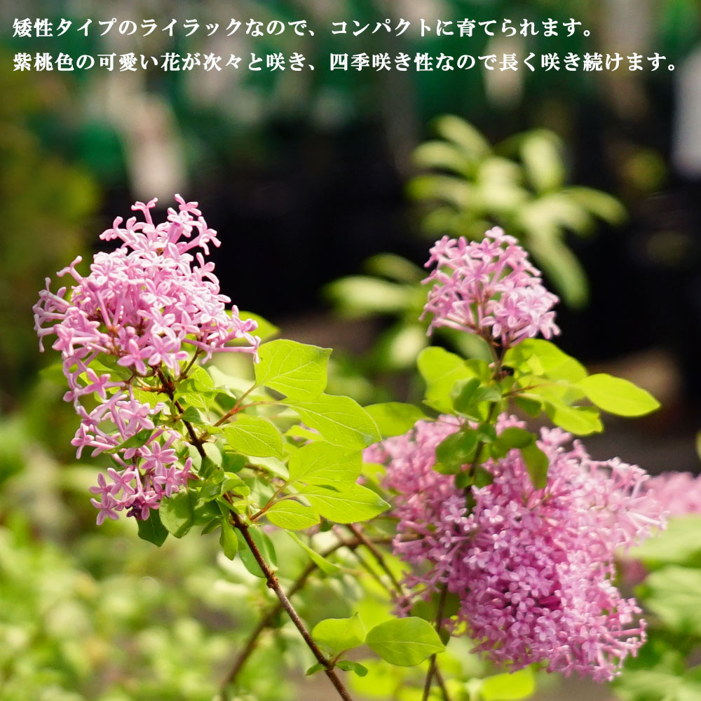 姫ライラックは贅沢な香りを自宅でも楽しめるようになったコンパクトなライラックです。樹高が高くならずこんもりと横に広がり、小さな庭や鉢植えでも育てやすいのが魅力です。耐暑性が強く、暖地でも育てやすくなりました。