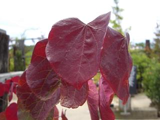 春の新葉は鮮明な赤紫色で大変美しく、かわいいハート型の葉も魅力です。季節が移ろうにしたがって緑色を帯びた濃い紫紅色の葉色になります。