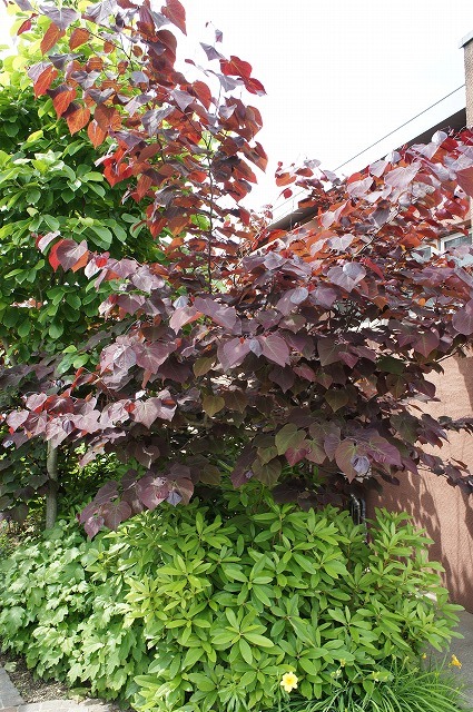 明るい緑の樹木や黄色のカラーリーフの樹木と合わせて植栽すると、赤紫色の葉が一層引き立ちます。シンボルツリーとしてもおすすめです。