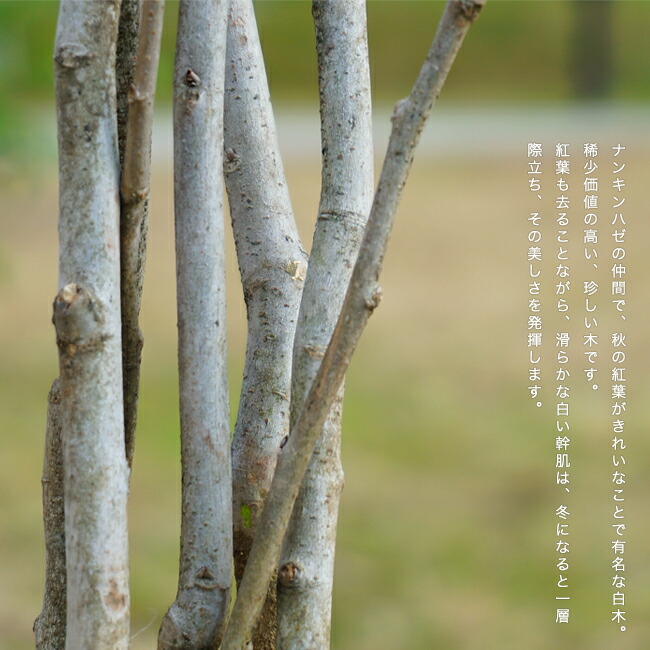 パッと見、なんの特徴もなさげなその姿。どこにでもありそうな落葉樹にみえますが、これだけ四季によって変化を楽しめる花木はありません!大きめの葉は、新芽の時はうっすらピンクがかり、徐々にその葉色を変えて、緑を濃くしていきます。秋には真っ赤な紅葉で見る人を魅了します。そして、「白木」の名前の由来にもなった「白い幹肌」。幼木のころはそれほど白さは目立ちませんが、幹、枝が太くなればその白さが目立ち始め、新緑や紅葉をより際立たせてくれます。冬は葉がなくなりますが、その分幹の白さがより引き立てられ、美しい立ち姿をみせてくれます。