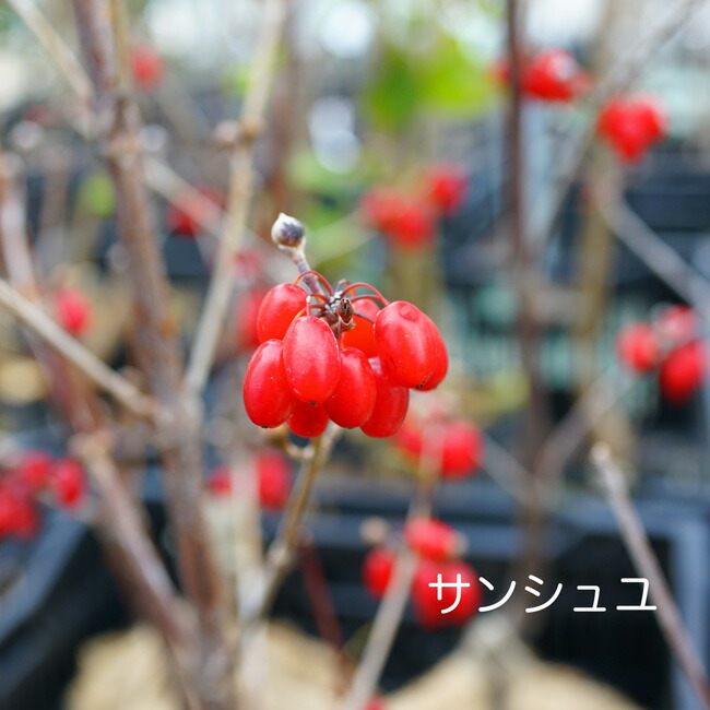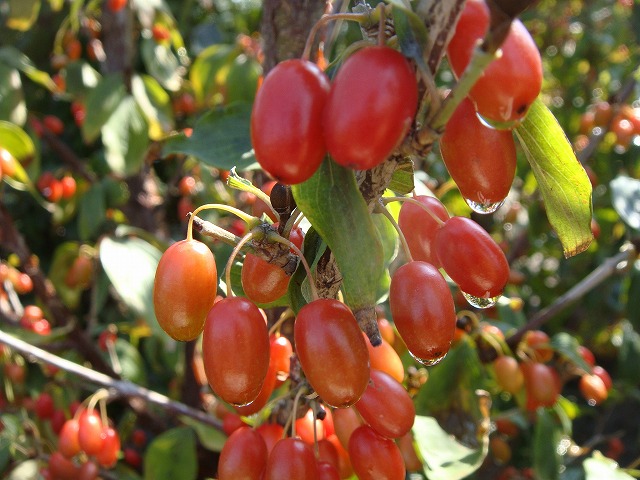 サンシュユ 金時(きんとき)は実つきの良い個体の選抜主です。果実は薬用になります。果実は甘く酸味がありますが渋みが強く、生食では美味しくないです。ジャムなどで利用できます。枝でヨーグルトができるそうですが手間なので作ったことはないです。