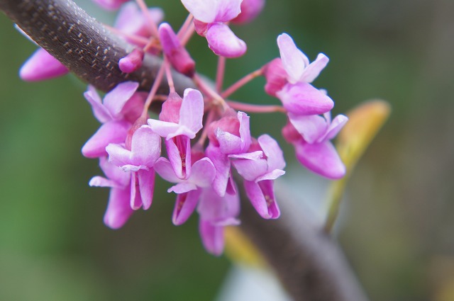 4月頃に枝を埋め尽くすように小さなピンク色の花が咲きます。マメ科の落葉樹で、花後に「さやえんどう」のような実をつけます。