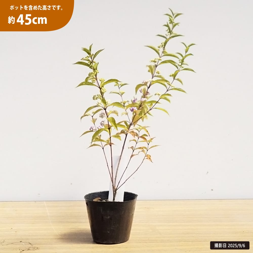 樹高1.2~2mの低木です。果実は固まってつくのが特徴でコシキブ(こむらさき)とも呼ばれます。背丈も小さくコンパクトにまとまります。生け花にも良く用いられる、美しい実をつける植物です。