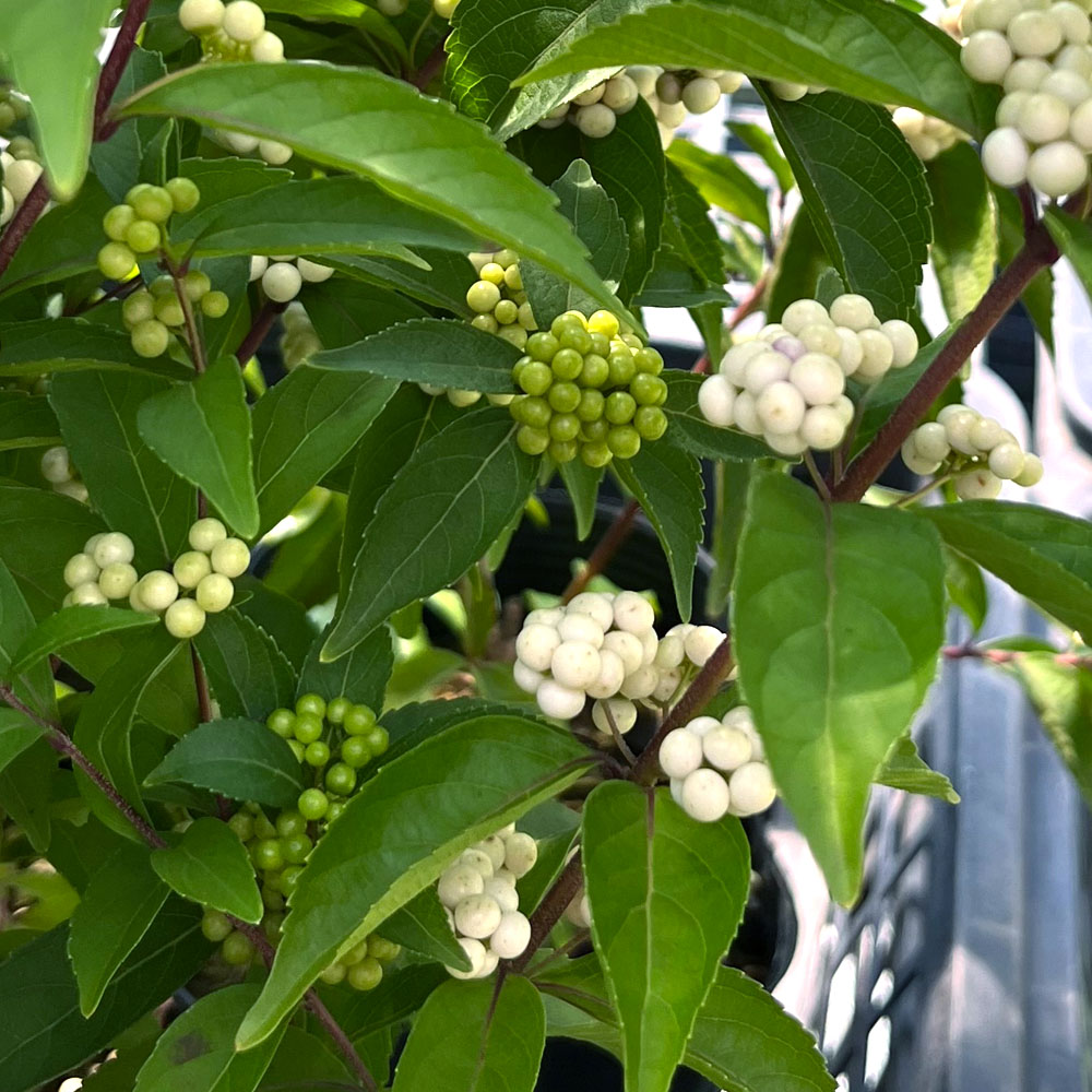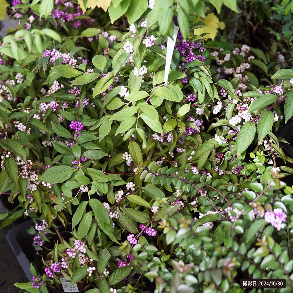 白式部(シロシキブ)は、ムラサキシキブの白実品種です。この品種は、実がぼんぼりの様に付き、枝のしなっているので実際はコシロシキブだと思われます。花が少なくなる秋の庭を明るく彩ります。
