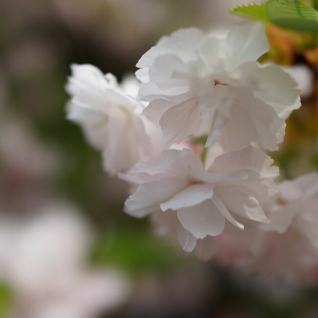 一葉(イチヨウ)の花色は淡紅色からのちに薄いピンク色、そして白に変化します。花弁数20~30枚の八重咲き。花の大きさは4~5cm。4月中旬開花で、大輪の八重桜の中では早咲きです。桜の銘花です。