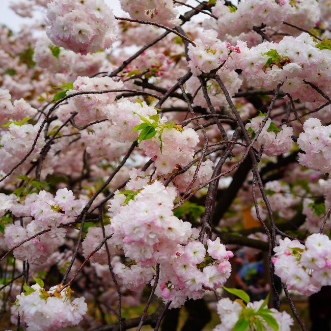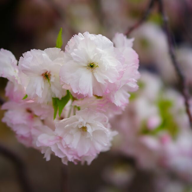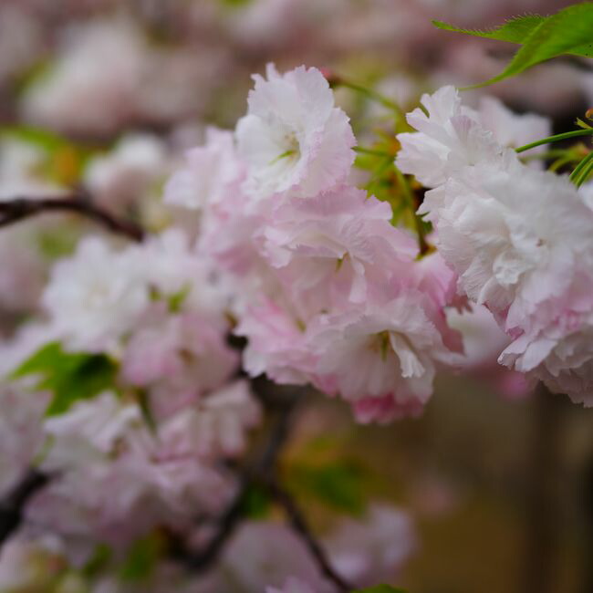4月下旬開花。松月(しょうげつ)は淡紅色で優美な桜です。花弁の裏が明るいピンクで表は白に近い緑色。満開になるとほぼ白色になります。花弁数は21~26枚の八重桜で、花径4.5~5.2cmの大輪咲き。花びらの先端に細かく切れ込みが入ります。花梗が長く垂れ下がるように咲きます。優美ですね。花より少し遅れて芽吹く黄緑色の若葉も加わり明るい印象です。