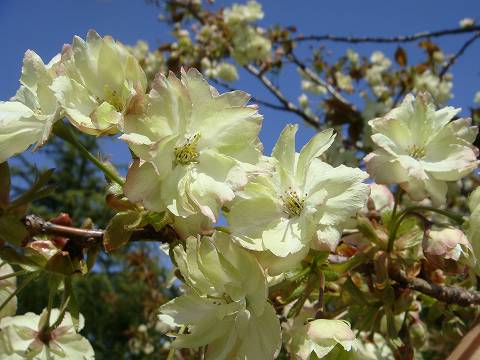 鬱金色(うこん色)と呼ばれる淡黄緑色をした、八重咲きの花を咲かせる中木性の、オオシマザクラ系サトザクラの園芸品種です。