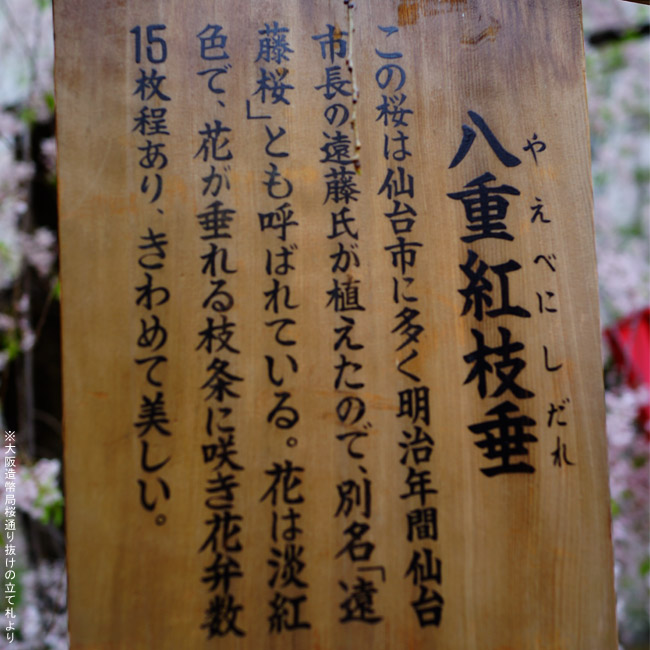 別名:遠藤桜(えんどうざくら)、仙台八重枝垂れ(せんだいやえしだれ)、仙台小桜(せんだいこざくら)平安紅枝垂れ(へいあんべにしだれ)とも呼ばれます。