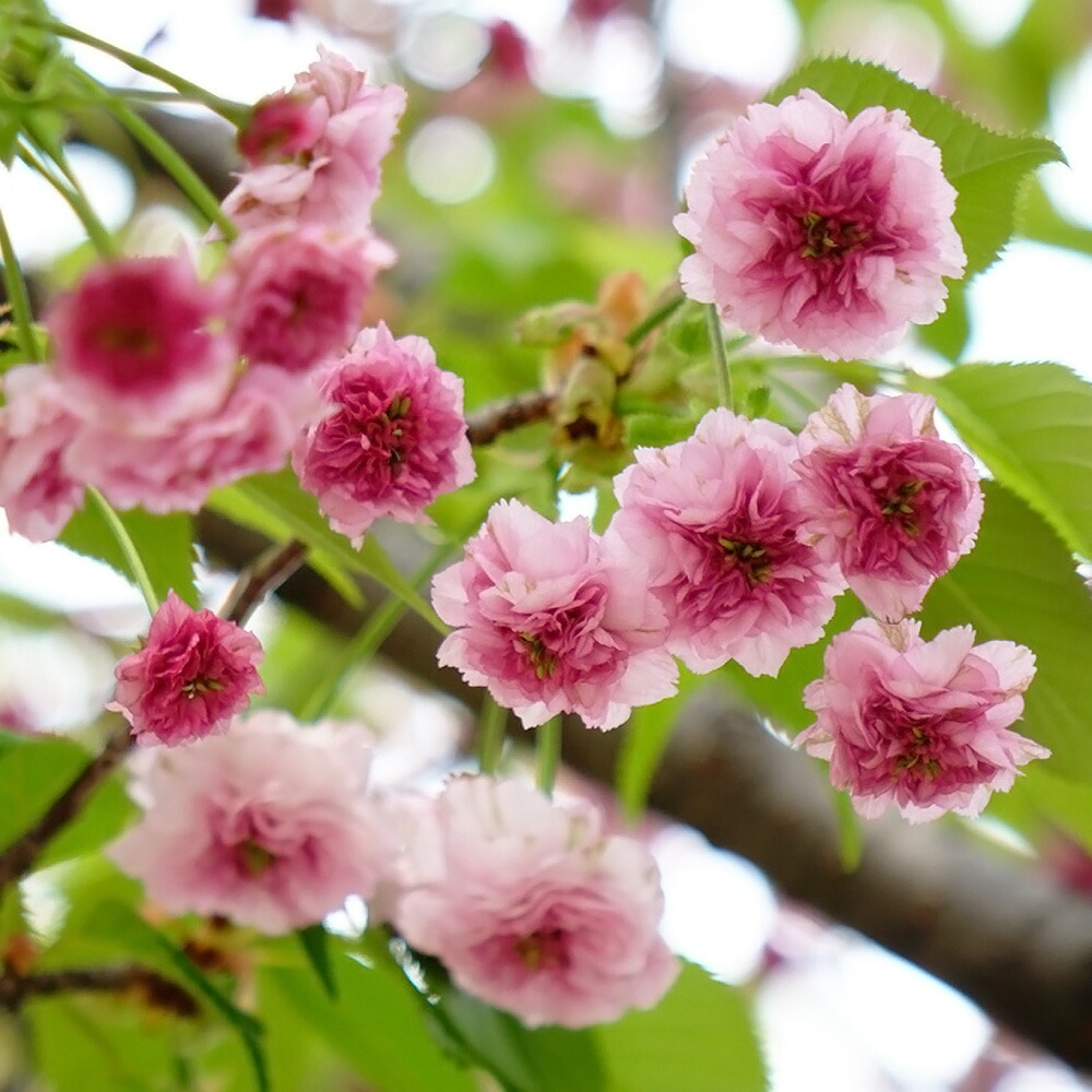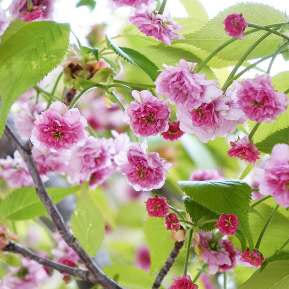 珍しいのは花弁の数だけではありません。一般的な桜と違い、咲き進むごとに濃紅色から薄紅色へ、最後は白に近いピンク色へと花色を変化させていきます。葉が完全に開いてから花が満開になります。