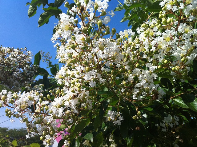 白花サルスベリは、サルスベリの白花種です。百日紅と書いて、サルスベリといいます。花は開花期が長く、7月~9月頃まで咲きます。風で揺れる白い花穂が夏を爽やかにしてくれます。