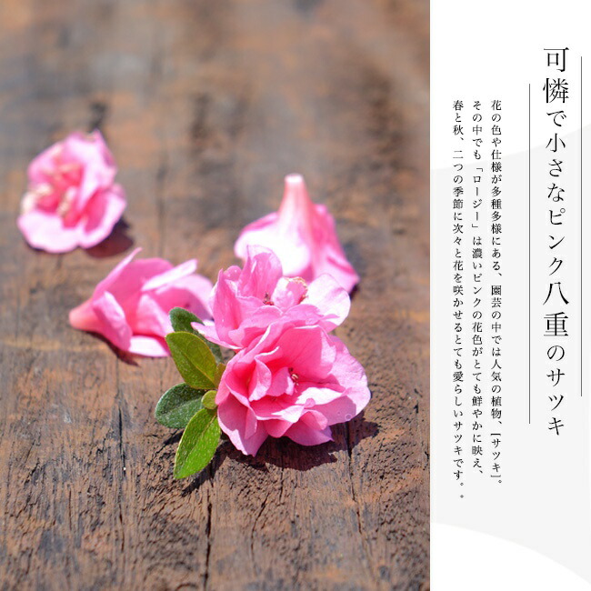 サツキ「ロージー」はピンク八重花の『春秋二季咲き』品種。5月頃と10月頃の1年に2回、可愛い花を楽しめます。直径約4cmくらいのピンク花が次々と咲くので開花期間が長いです。萌芽力が強く、葉が細かく密生することから、根締め(庭木や鉢植えの木などの根もとに植える草)やグランドカバーや生垣にもおすすめです。日本庭園の刈込によく使われていますが、和風庭園だけでなく洋風庭園にも良く合います。