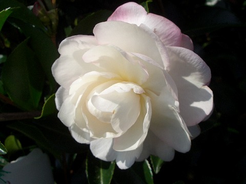早咲きの朝倉サザンカ。まずは、この山茶花から始まります。蕾はピンクで開くと外側に淡く桃色を帯びる白八重カップ咲きです。秋から冬にかけて咲く清楚な花が特徴です。刈り込みに耐えるので、生垣や庭木の植え込みに好まれます。古い時代から親しみのある花木です。