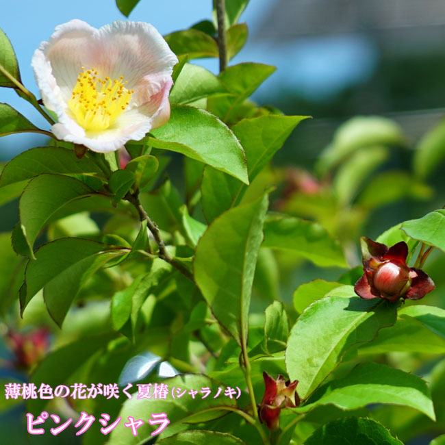 ピンクシャラノキ「夜明け前」は、白の一重咲きの花に、薄ピンクの花弁の縁に紅が入る姿が美しいシャラノキです。一才性ですので花付きがいいのも魅力。