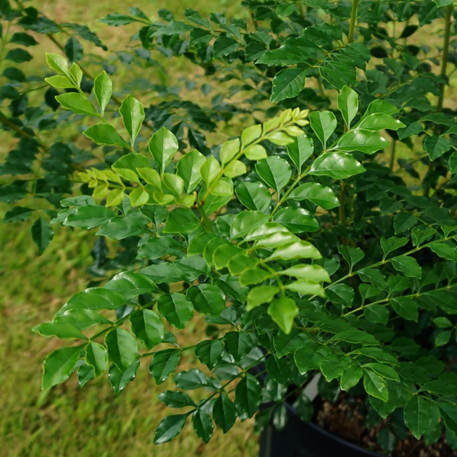シマトネリコの葉。光沢がある小さな葉は樹齢とともに2倍弱くらいの大きさになります。