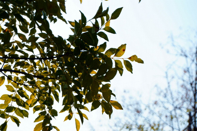 冬に見上げた空にそよぐ、シマトネリコの葉。冬は葉が傷んできます。