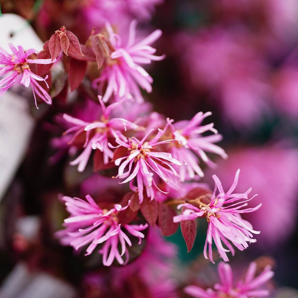 赤葉紅花トキワマンサクは葉が赤紫褐色で、パープルピンクの花です。