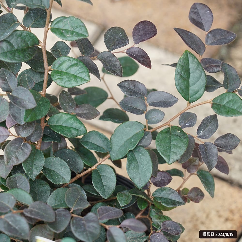 「プラムゴージャス」はトキワマンサクの中でもコンパクトな枝垂れ品種で樹形が自然にまとまります。葉色は一年中深いプラムカラー。年に2回、春と秋に濃いピンクの花を咲かせます。