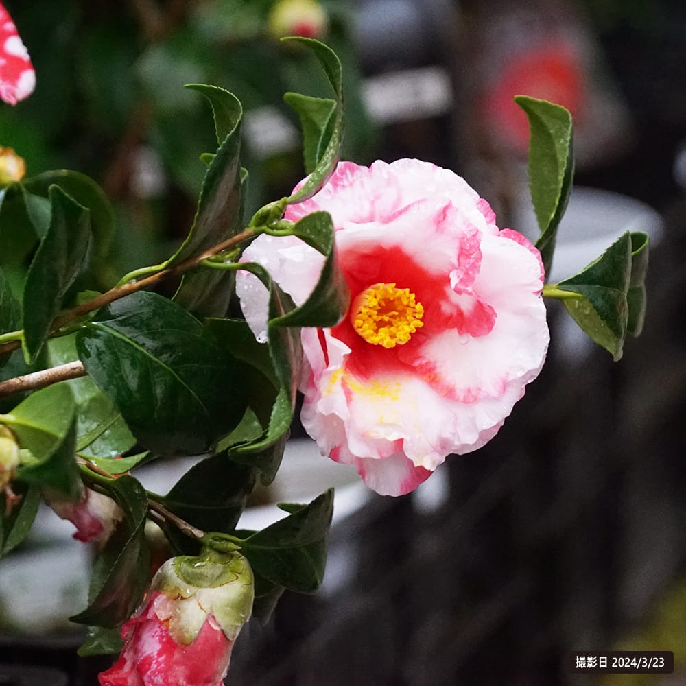 岩根絞りはゴージャスな大輪咲き。花色が変化する珍しいツバキです。岩根絞り の絞りの入り方は不規則で、赤ばかりや白ばかりの花色になる場合があります。1本の木に赤と白と絞り咲きの3色で咲くこともあり、人気があるツバキのひとつです。