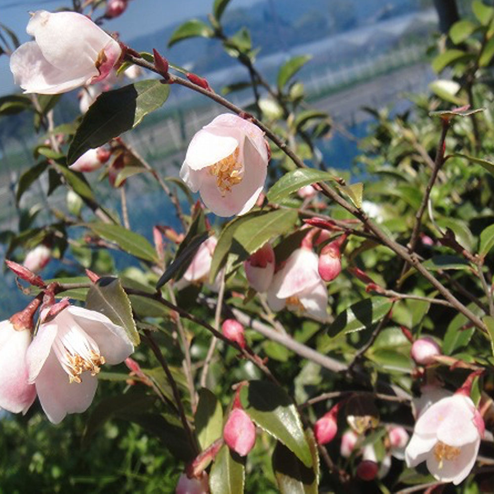 エリナは、中国原産カメリアの改良品種で、冬に花を咲かせる椿とは違い、3月~4月頃に薄桃色の小さな花を咲かせます。 花が恥ずかしそうにうつむき加減に咲きます。柔らかな雰囲気の小輪花と細い葉が作る樹形の美しさが特徴です。 桃色の蕾も可愛らしく、たくさんの花をつけるので庭に華やかさを添えてくれます。