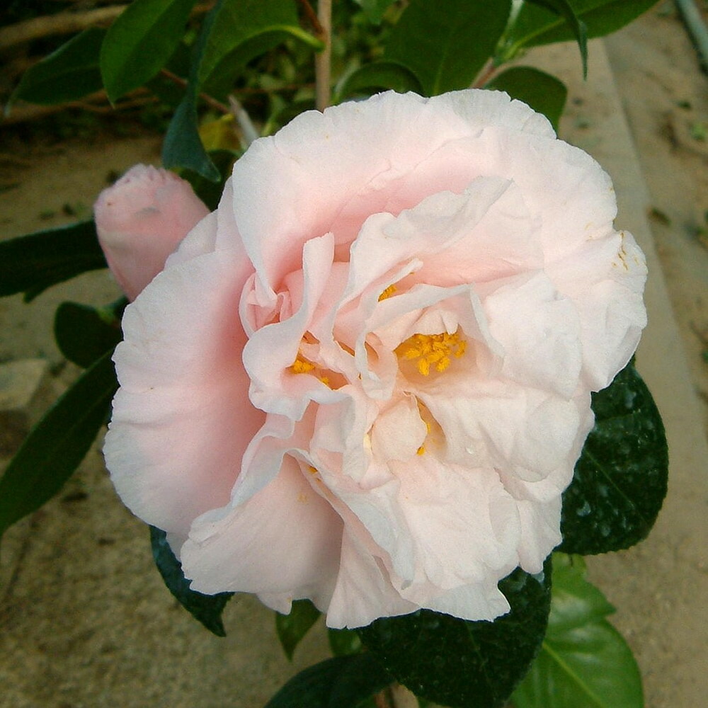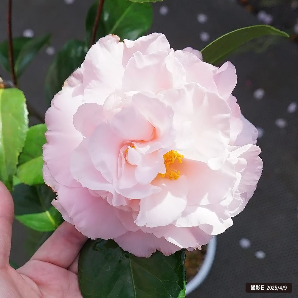 洋種ツバキで、3~4月頃に10cmを超える極大輪の花が咲きます。淡いピンク色の八重の牡丹咲きで、黄色くしっかりした葯(やく)が引立ちます。優しく優雅な雰囲気でほのかな香りがあります。