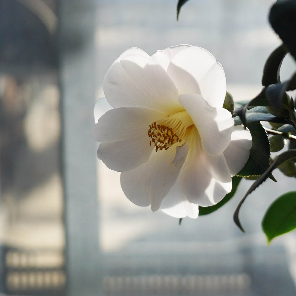 シルバータワーは、カルフォルニアで作出された西洋ツバキ。白色の八重蓮華咲きで、中輪の花を咲かせます。