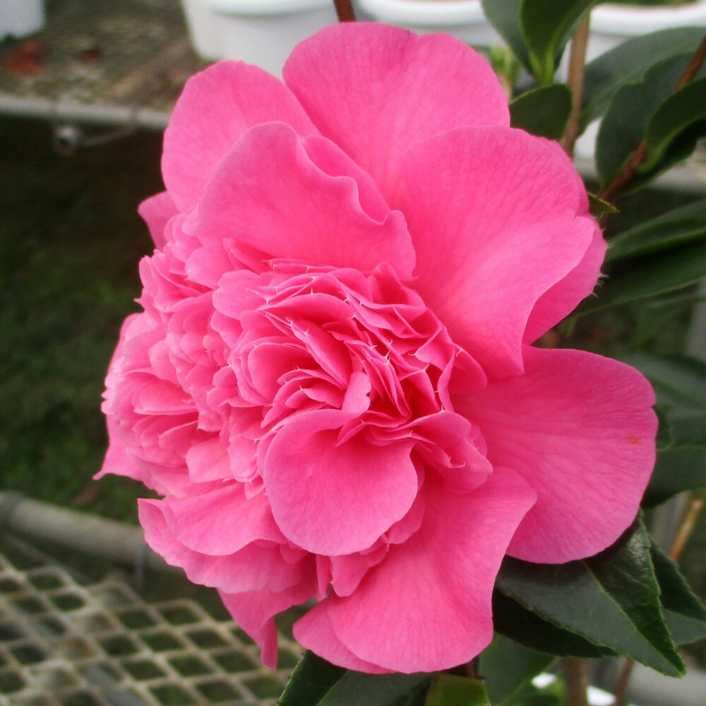 トウツバキの系統でニュージーランドで改良されたツバキです。濃いピンク色でカーネーションのようなフリルのついた牡丹咲き大輪品種。華やかな花姿が楽しめます。