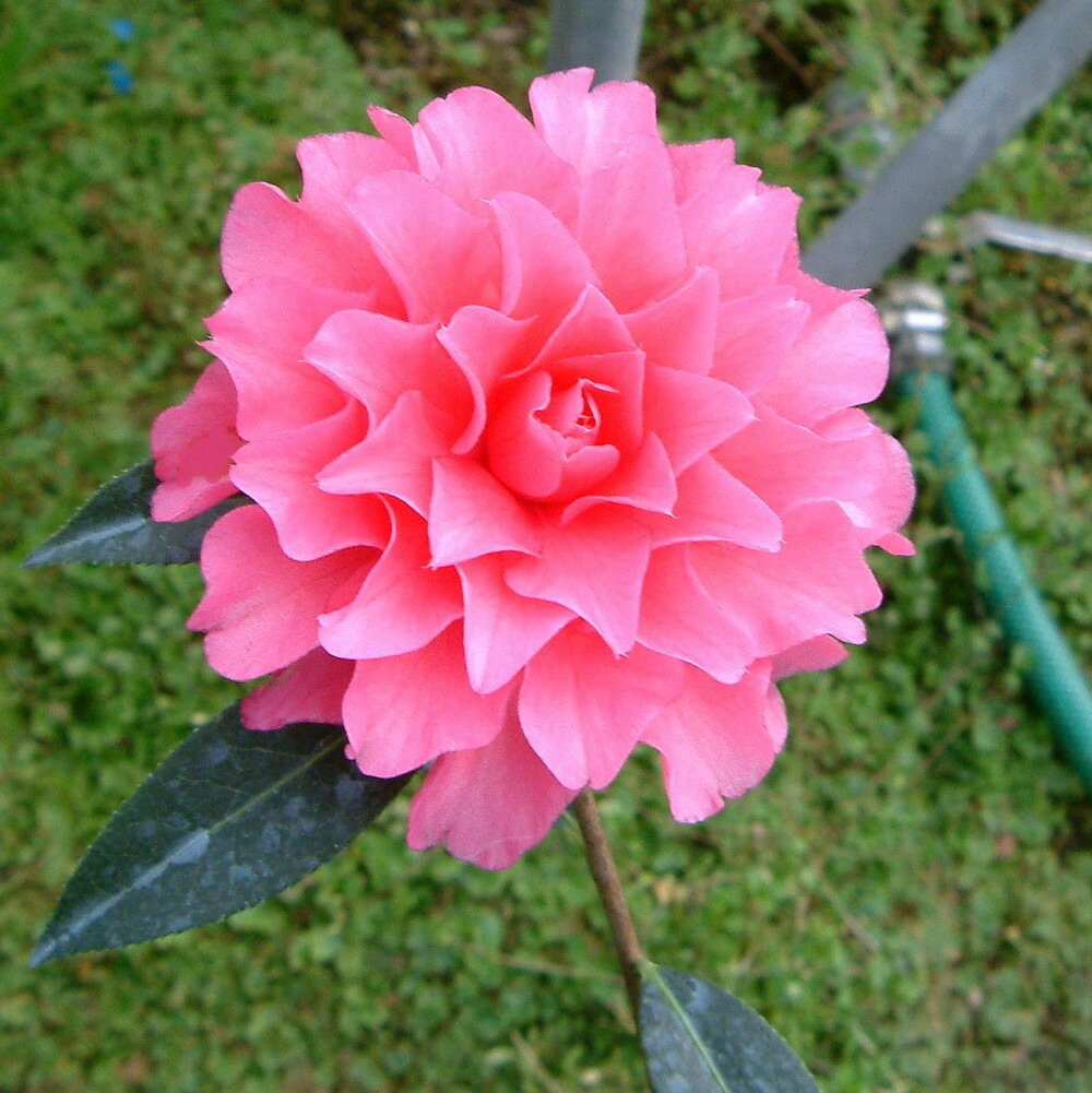 濃い紅色の大輪花が咲くファイヤーダンス。八重~蓮華咲きで、花径は10~15cmと、名前負けしない存在感のあるツバキです。