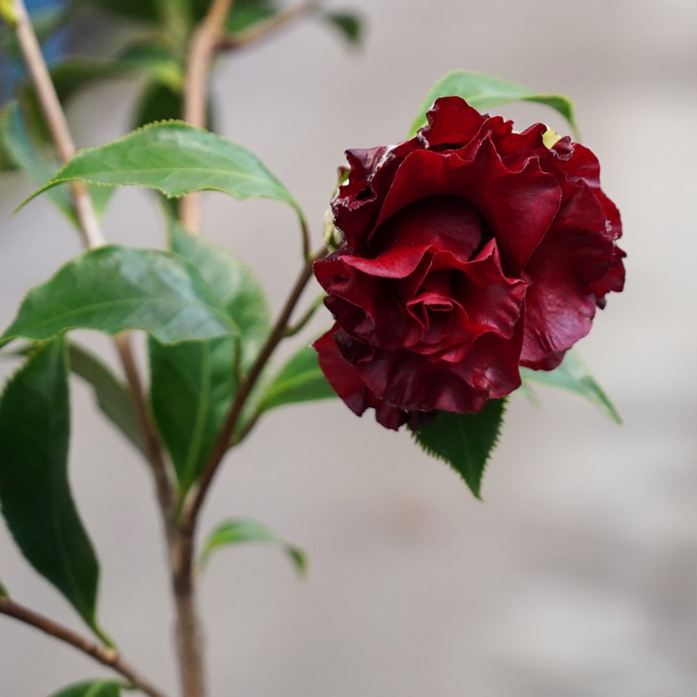 濃く深い黒紅色の、珍しい黒花系のツバキです。花径9~12cm程、牡丹咲き~獅子咲きの大輪花で、花弁には光沢があります。 葉も特徴的で、細かい鋸歯があり葉脈が浮き出ています。