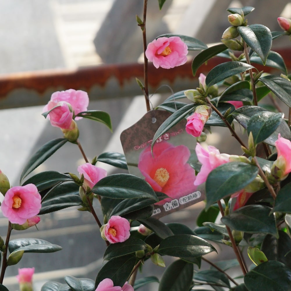 紫色を帯びたピンク色の一重、猪口咲きの侘助椿です。岡山県で発見され、1979年に発表されました。花一つ一つは極小輪で控えめですが、黄色い筒しべが可愛らしく、たくさんの花を咲かせてくれます。開花時期は11~3月頃です。