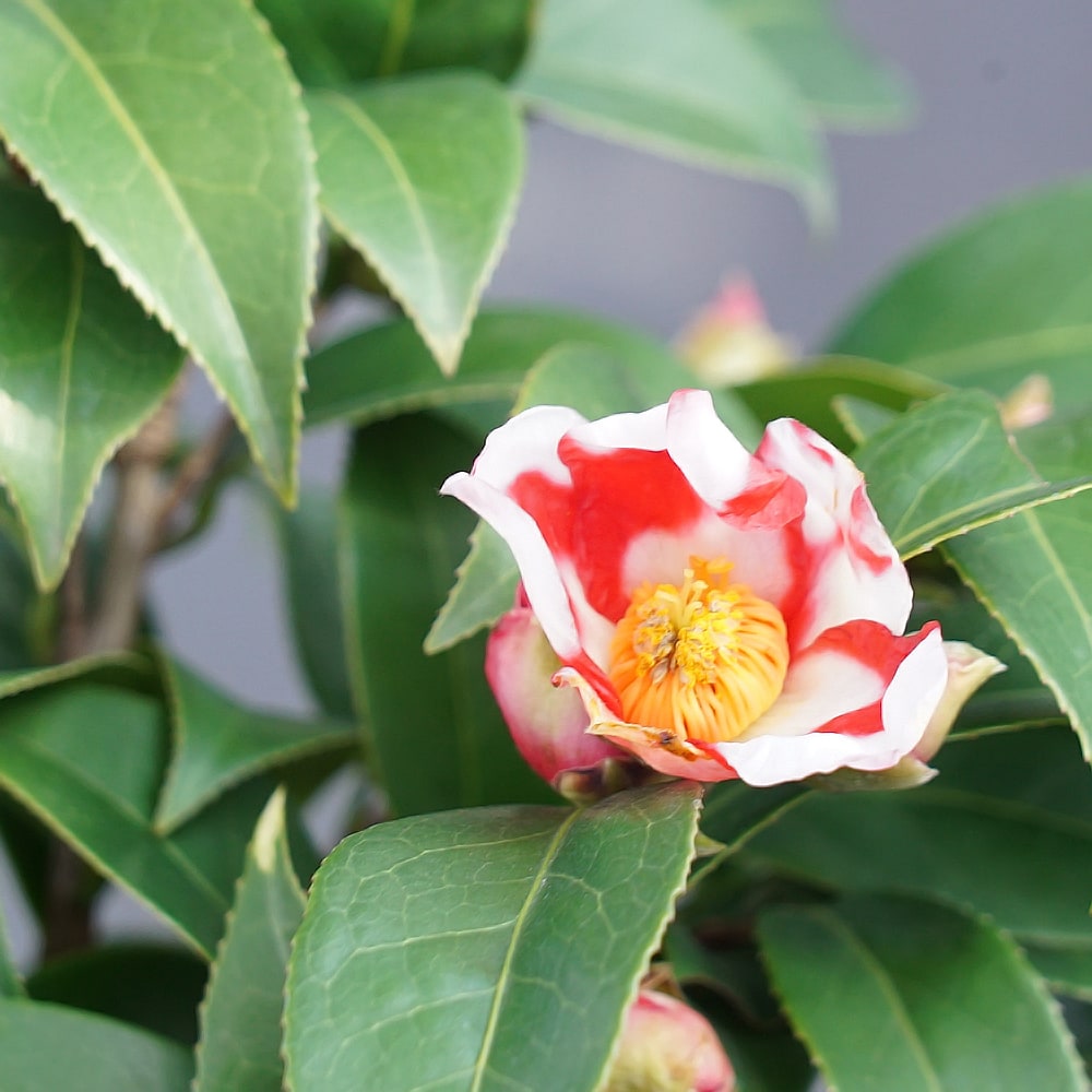 花は一重の平開咲き。鮮やかな朱紅色に白斑が多めに入り、華やかな印象です。盆栽にもおすすめです。