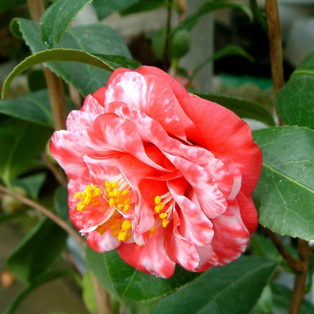 鹿児島は、紅色地の白斑入り、八重咲き松笠型で中輪の花を咲かせます。
