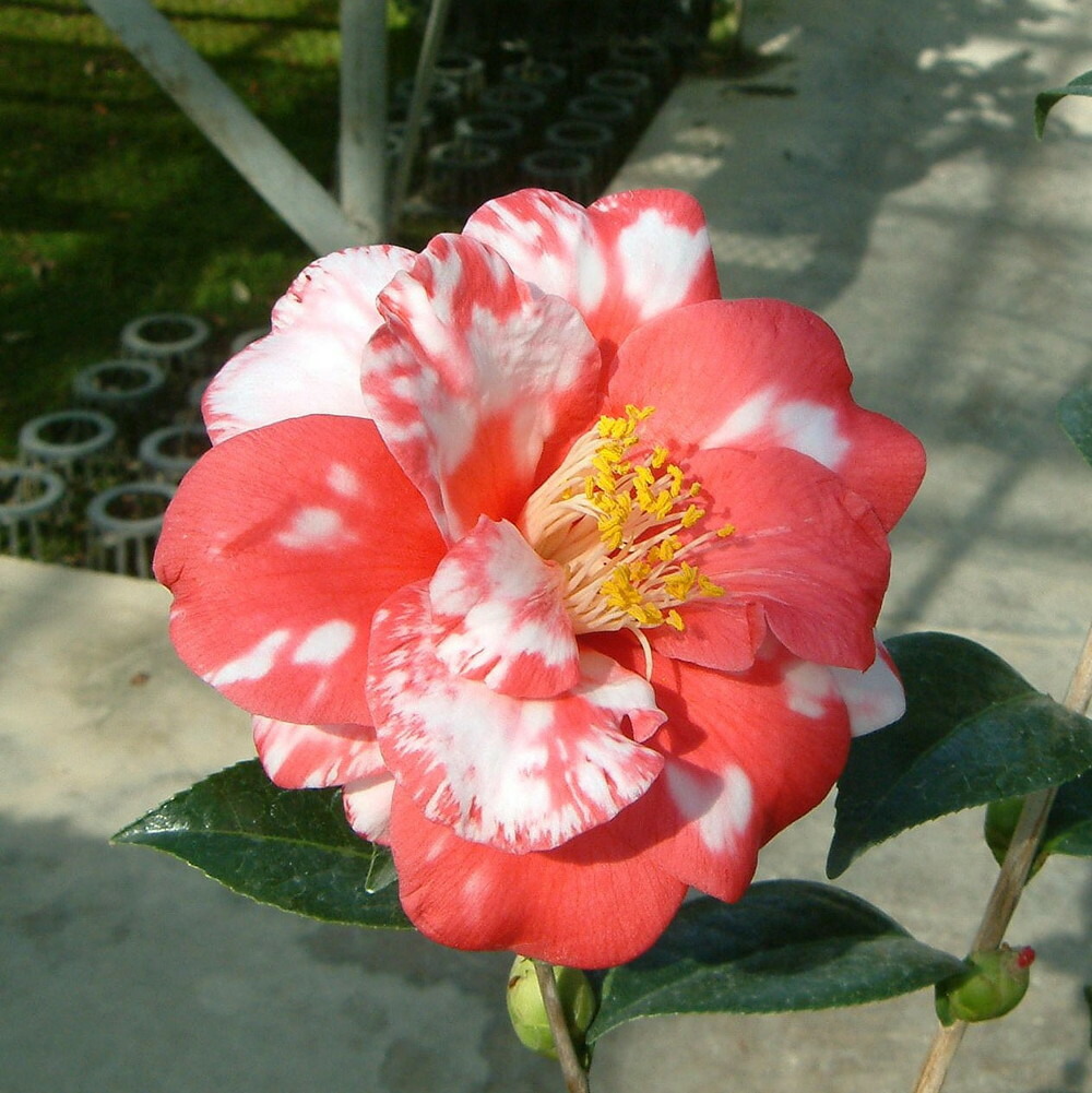 正義は、久留米ツバキの代表品種。シーボルトがベルギーに持ち帰り、多くの品種の親になった品種として知られています。海外では「ドンケラリー」という名で知られています。 濃い紅色の花弁に大小の白斑が入る八重の蓮華咲き大輪品種です。稀に斑が入らない真っ赤な花が咲くこともあるようです。