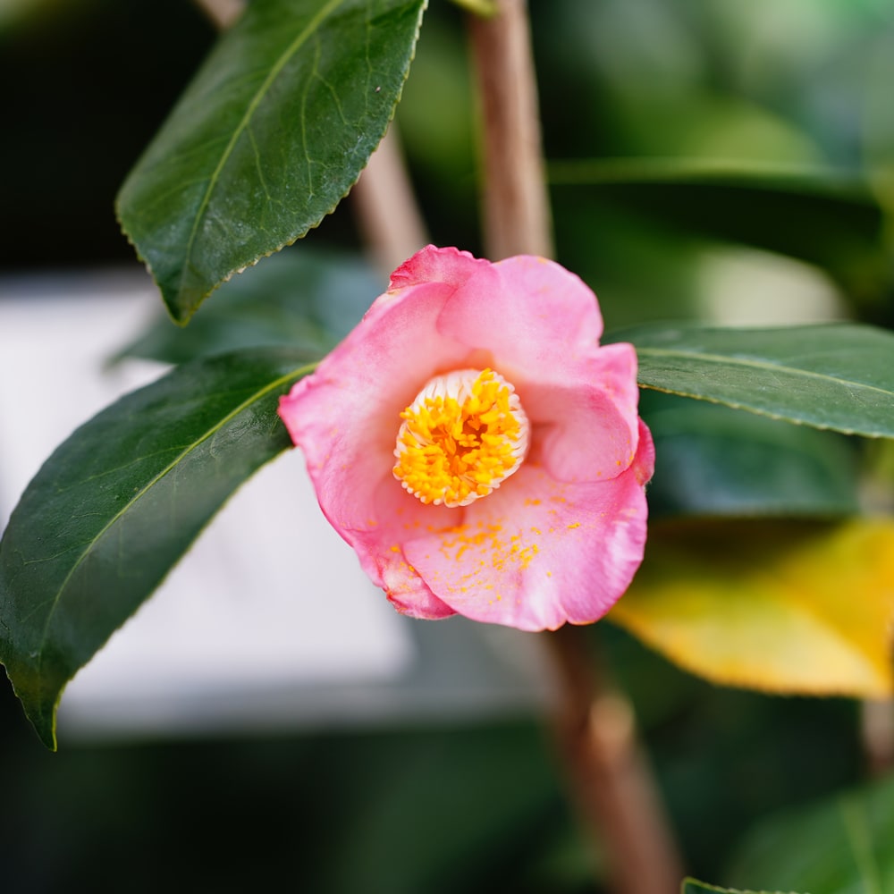 素粧は、ピンク色の可憐なツバキです。中輪の桃色花で筒咲き。