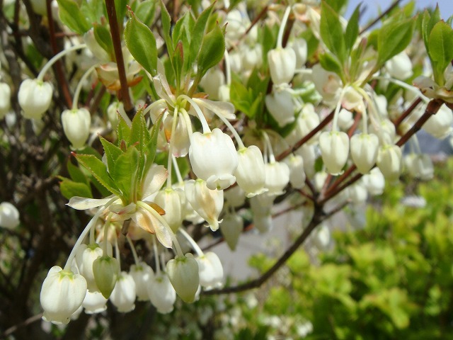 春に白い花が垂れ下がるように咲き、艶美な樹形を作ります。スズランに似た釣鐘状の小さい花を咲かせます。春の花も見事ですが、秋の紅葉もこれまた素晴らしいです。