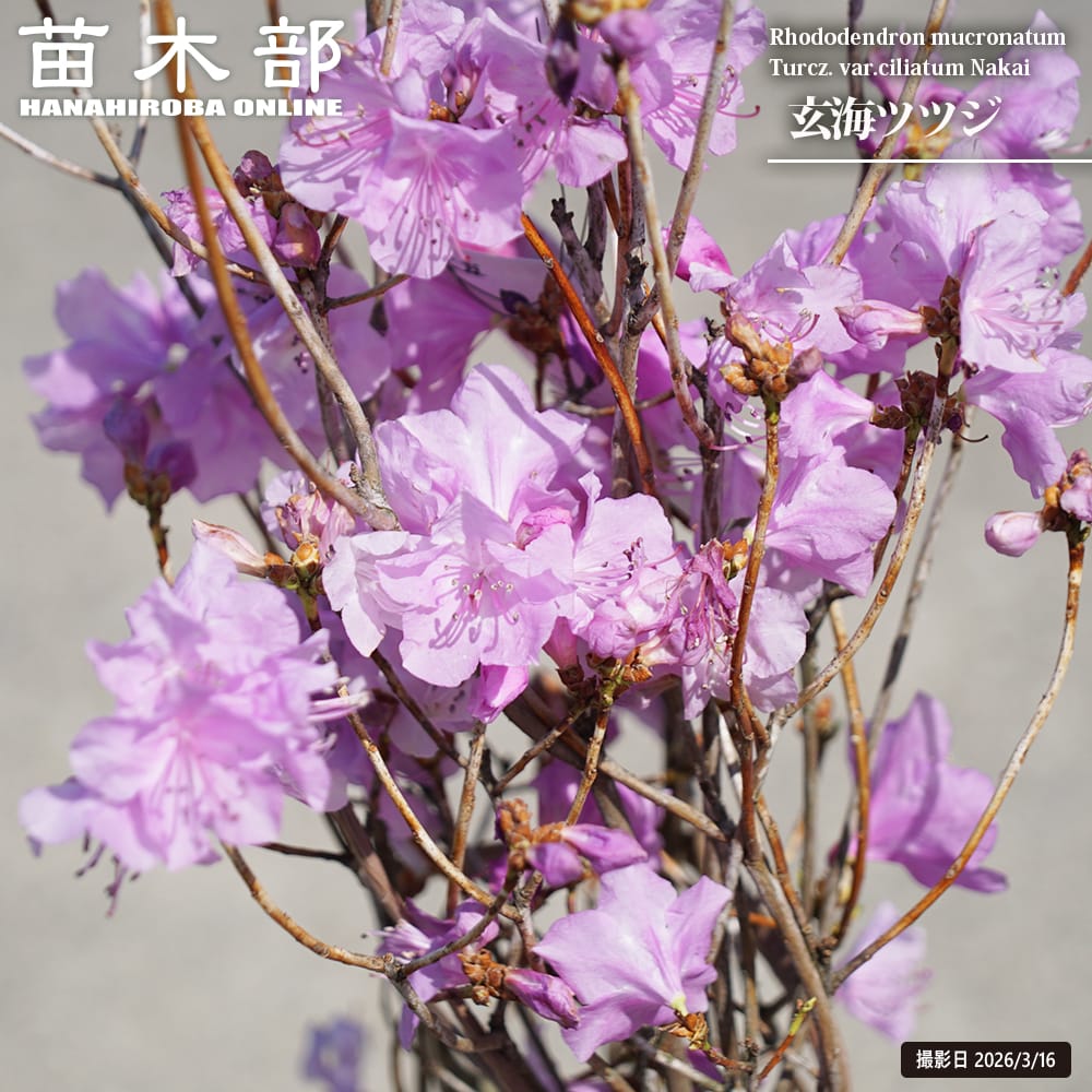 「玄海ツツジ」は玄界灘を囲むように分布することからゲンカイツツジと命名されました。。枝先にロウト型の花を数輪ずつつける落葉性ツツジ。カラムラサキツツジの変種です。ミツバツツジとよく似ていますが、玄海ツツジは花に丸みがあり葉裏や枝に毛があります。園芸品種も数多く存在しますが、原種は準絶滅危惧種に指定されています。