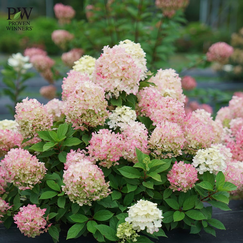 「ミニファイヤーライト」は、これまででもっとも小さいノリウツギの1つ。コンパクトでも花付きは良く緑の葉を覆い覆いつくすように円錐状の花穂をたくさんつけます。夏に咲くライムグリーンの花は、秋になると徐々に淡いピンク色を帯び、花色変化を楽しめます。