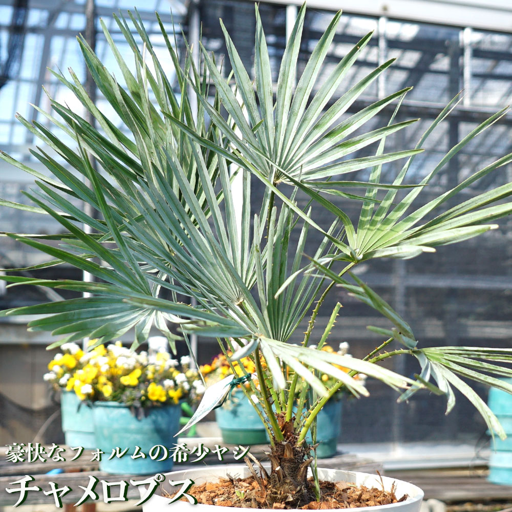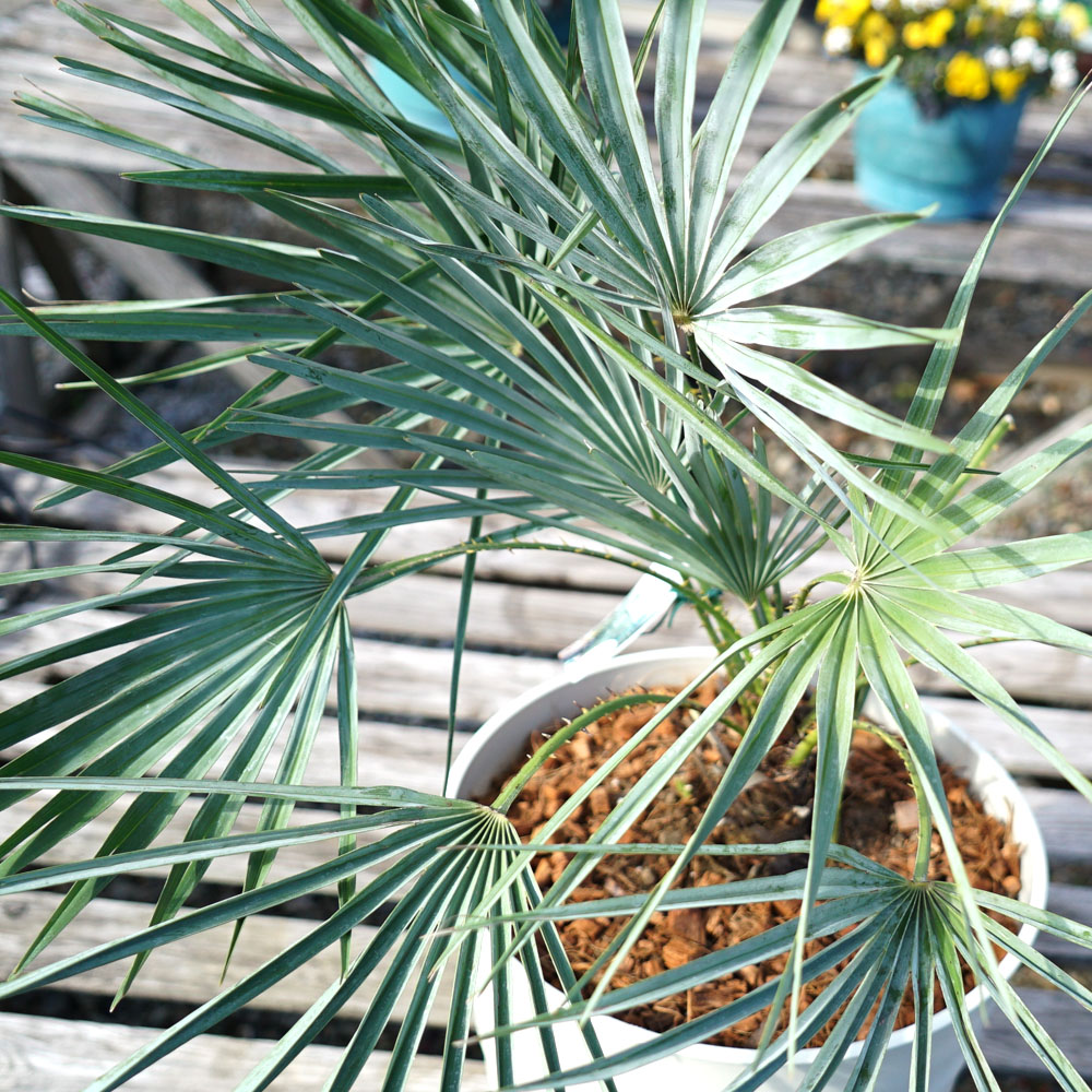 シュッとした青みが買ったシルバーグリーンの葉が美しい寒さに強いヤシです。葉は扇状で、青緑色をしています。青みがかった葉が密集しているので、背丈が小さくても存在感があるコンパクトタイプのヤシです。小型で扇形の葉を持ち、幹は群生状になることが多いです。