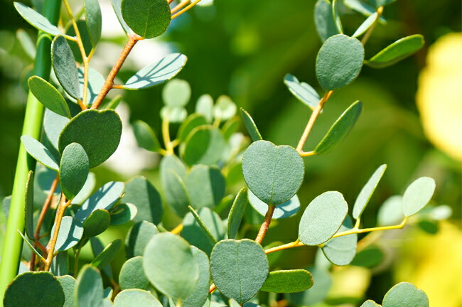 ハート型の葉っぱが可愛いユーカリ。花が咲いた枝を切花にしてもおしゃれです。樹皮がめくれて、つるつるのきれいな幹肌を見せてくれるユーカリをガムといいます。寄せ植えで動きのある葉を楽しんでいただいたり、枝が柔らかいのでブーケやリースにご利用いただくなど、用途も様々です。