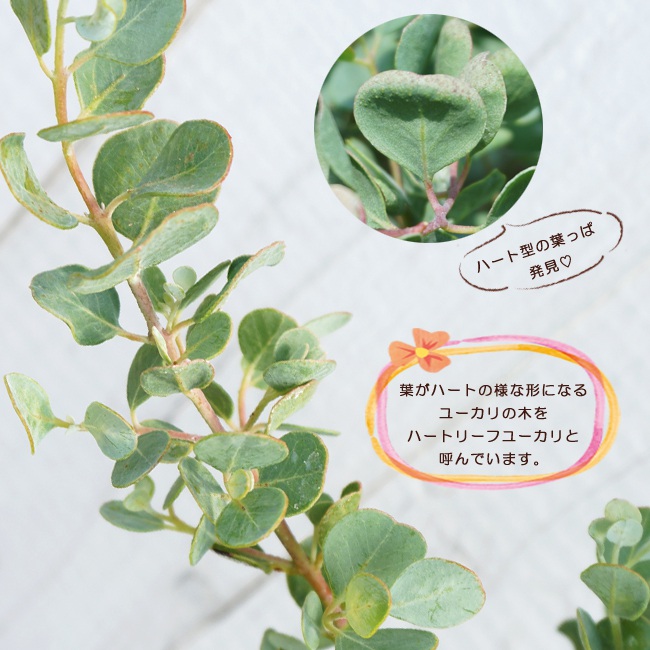 葉の形がハートのように見えるユーカリをハートリーフユーカリと呼んでいます。 ハートリーフと呼ばれるユーカリには何種類かの品種があり、本商品の品種の詳細については調査中です。以前販売していたリトルハートとの違いは、現時点では確認できておりません。分かり次第ページに反映させていきます。