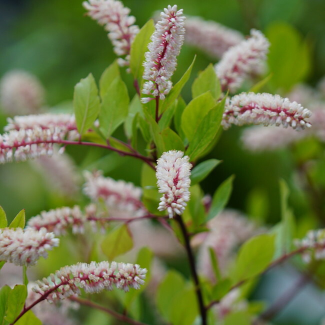 花軸とガクが少し紫桃色で白から淡いピンクに見えます。花穂は短くブラシ状の花がやや立ち上がり気味に咲きます。