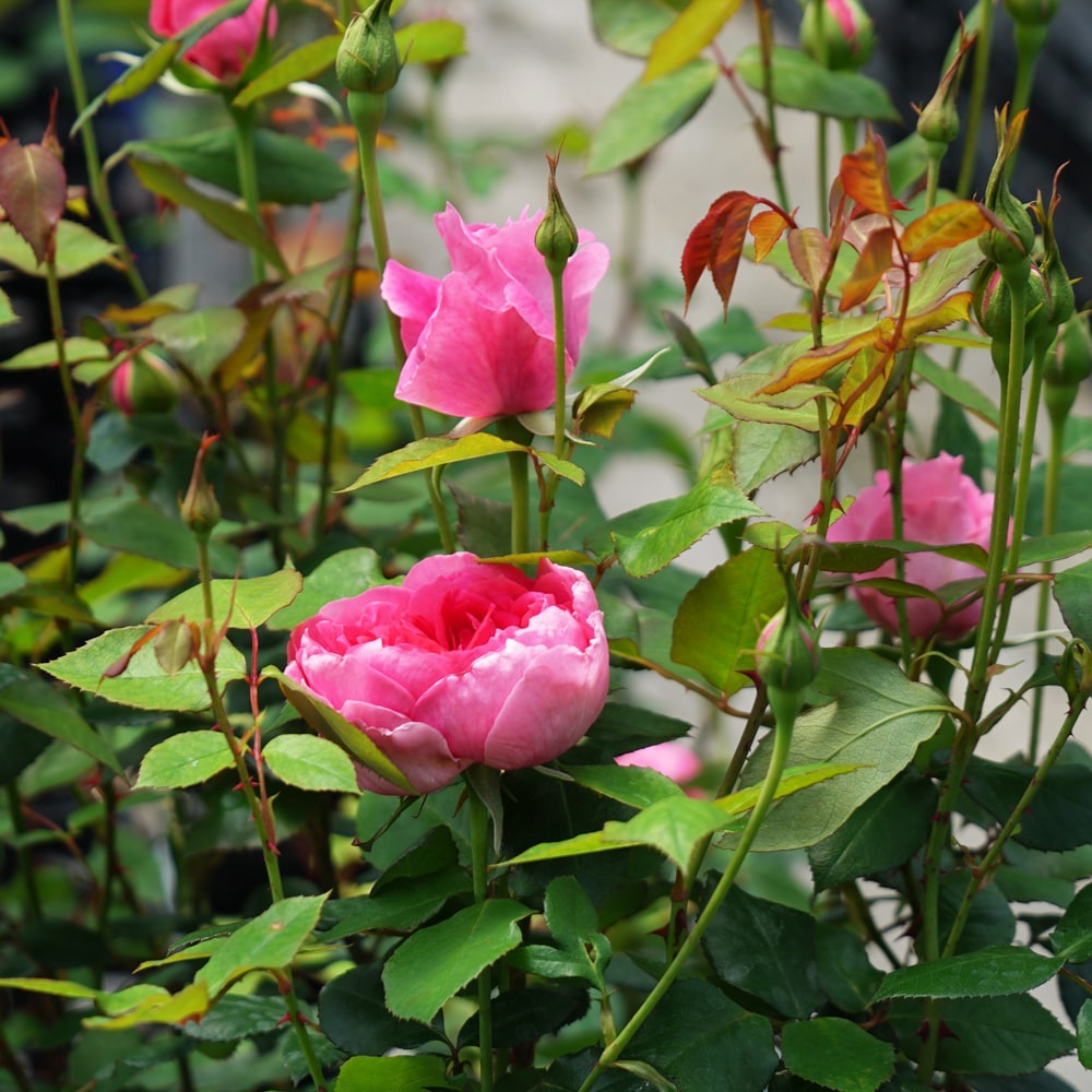 LCは仕立て方によってつるバラの系統なのでフェンスに添わすことが可能です。また、短く切り戻しブッシュ樹形にしても楽しめます。四季咲きの傾向が強い品種も多いため、秋の開花を楽しみたいのでしたら、つる仕立てにする際も、木立仕立てのような切り戻し剪定を行います。