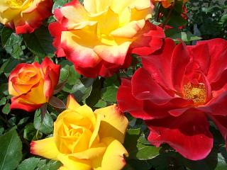 咲き始めは黄色で、次第に赤く変化する花色です。黄色と赤の覆輪、その後朱赤のバラに変化します、まるで3色が咲き乱れるようなバラです。1株で3色乱れ咲くのがうれしいですね。楽しみが3倍という感じで欲張りな品種です。数輪が大きな房咲きになって咲き、華やかです。花つき、花もちが良く、株全体を花が覆います。枝は赤実がかり、葉は濃い緑葉で存在感があります。早咲きで春の初めから咲き始めます。