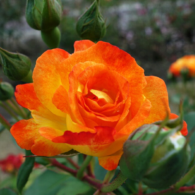 人は欲張りな生き物。変化する花色。このバラは3色咲きです。咲き始めは黄色で次第にオレンジに、そして朱赤に変化して行きます。黄色、オレンジ、赤の3色の花色が咲き乱れる様は、小太鼓、中太鼓、大太鼓のふれ太鼓のイメージ。音のない祭り囃子です。