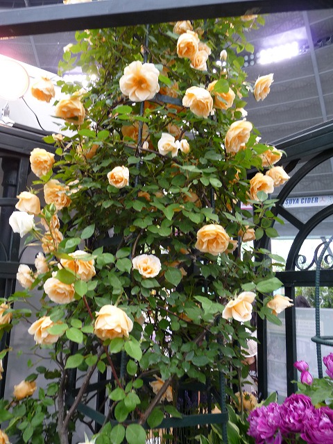 ヤマブキ色の半剣弁高芯咲きです。春の花色は淡く、秋は濃くなります。良く伸びる枝にアプリコットイエローの花がうつむいて咲き、ティーの芳香を漂わせながら優雅な空間を創りだします。香りにはジメトキシメチルベンゼンを含みます。よく返り咲くので、春から秋、冬まで花が楽しめるつるバラです。耐病性がある品種です。花はうつむくように咲きますので、アーチや壁面仕立てにおすすめです。 |
