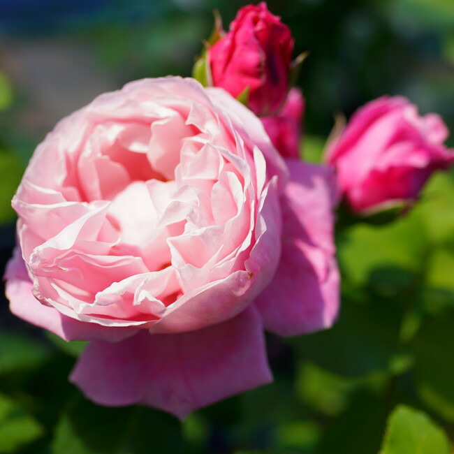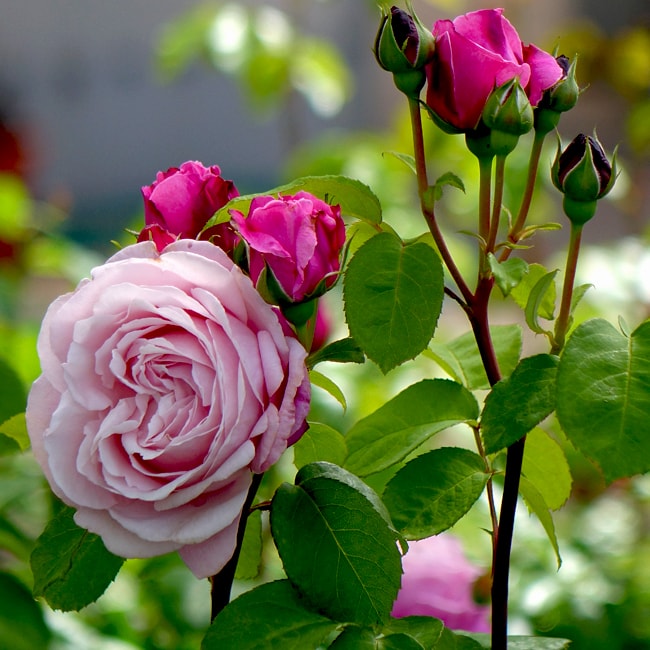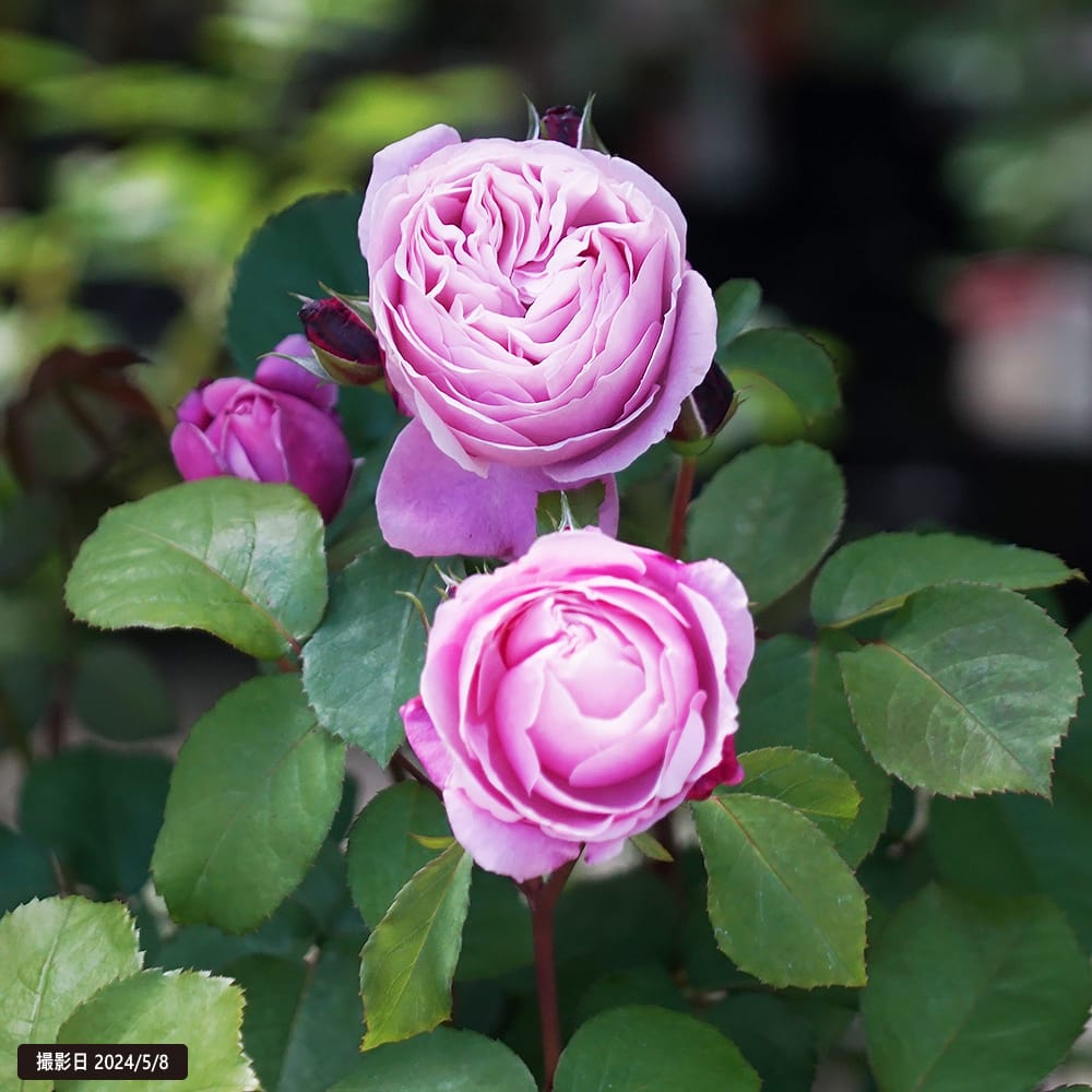 赤黒の丸いつぼみが膨らみきると、しっとりとしたピンク~ライラック色の中輪カップ咲きの花を咲かせます。深い緑の葉にグラデーションがかったピンクの花が良く映えます。