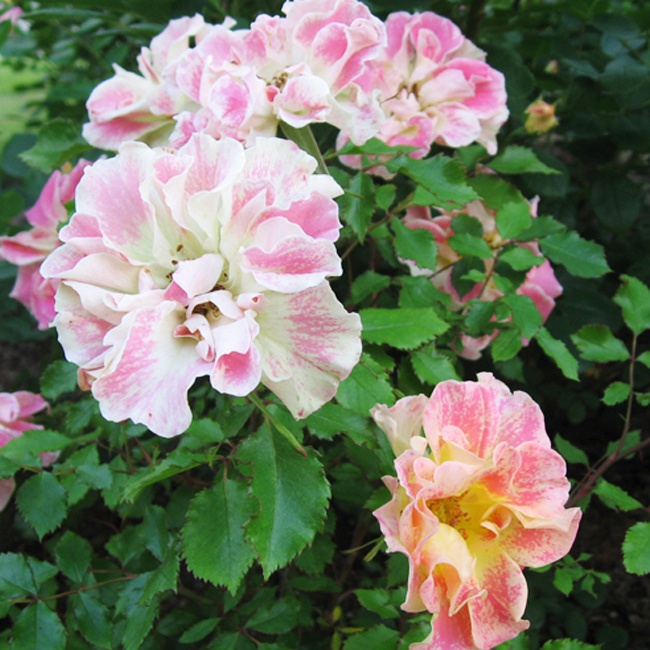 シュラブローズはブッシュローズ(木立バラ)とクライミングローズ(つるバラ)の中間的な樹形で、やや高性になるものや半つる性になるものです。鉢植えや花壇、オベリスクなど使い勝手が良いので、用途やシーンを選ばずに用いやすい品種が多いです。